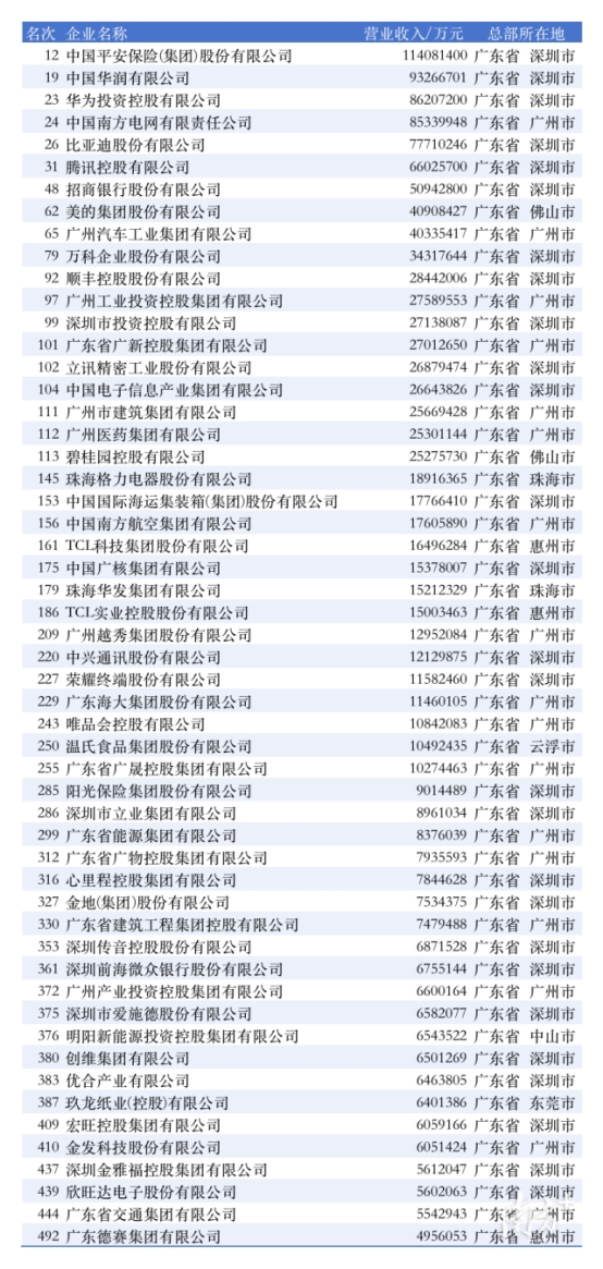 具体到50强企业中,广东企业达6家,占比约11%。在中国平安之后,排名最高的粤企是华为,以8620.7亿元营收位居第23位,南方电网紧随其后,位列第24位,营收为8534亿元。比亚迪、腾讯、招商银行则分别居26、31、48位。