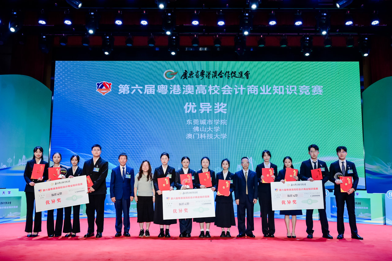 广东省审计厅二级巡视员彭镇悦、佛山大学副校长张敏、竞赛评委会主任王华为东莞城市学院、佛山大学、澳门科技大学、中山大学、香港中文大学、香港浸会大学、澳门大学参赛队颁发优异奖
