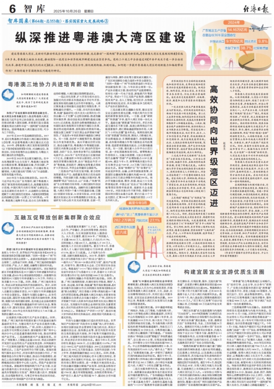 10月26日,《经济日报》在其智库第六版,以全版篇幅刊发《纵深推进粤港澳大湾区建设》一文。文章系统梳理了粤港澳大湾区的建设历程与显著成效,特邀多位权威专家对关键议题进行深度探讨。现全文转载如下: