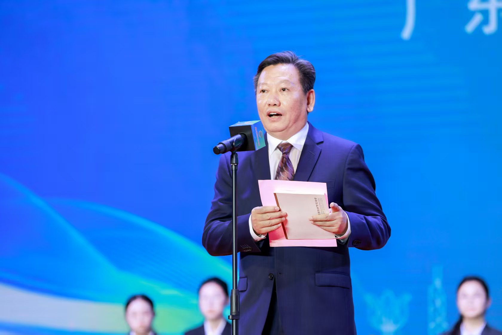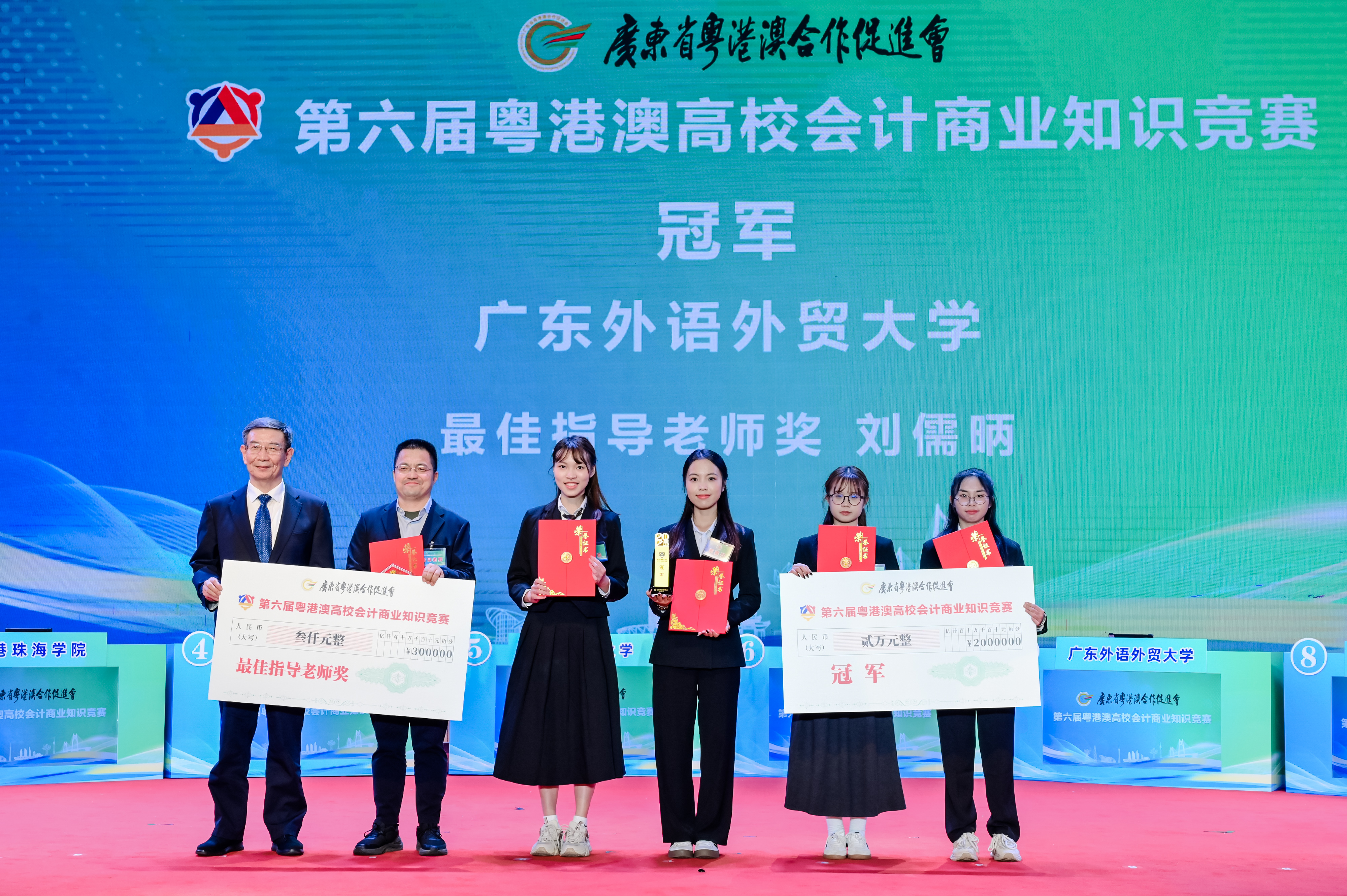 广东省人大常委会副主任、广东省总工会主席、广东省粤港澳合作促进会会长黄宁生为广东外语外贸大学参赛队和指导老师刘儒昞颁发冠军奖及最佳指导老师奖