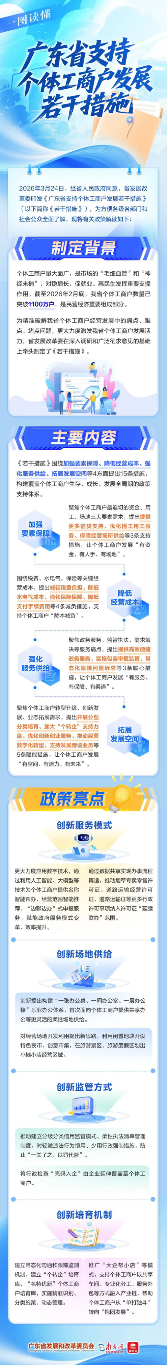 为更大力度促进全省个体工商户持续健康发展,广东省发展改革委于近日正式印发《广东省支持个体工商户发展若干措施》(以下简称《若干措施》),从加强要素保障、降低经营成本、强化服务供给、拓展发展空间等4方面提出15条支持措施。