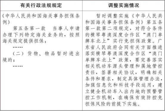 一、为推进横琴粤澳深度合作区建设,深化粤港澳大湾区合作,同意自即日起在广东省暂时调整实施《中华人民共和国海关事务担保条例》的有关规定(目录附后),对符合条件的澳门机动车经横琴粤澳深度合作区暂时入出广东省其他区域(以下称横琴粤澳深度合作区“澳门单牌车北上”)实行免担保政策。